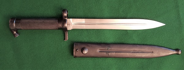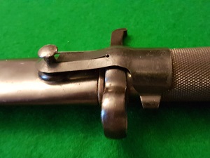 Vom Bajonett m/96 gabe es im Laufe der Zeit verschiedene Ausfertigungen, deren Unterschied in kleinen Details lag. In der Literatur finden in der Regel zwei Varianten Erwähnung. Auf dem linken Bild ist die ältere - im Originalzustand heute äußerst seltene - Variante mit flachem Verriegelungsknopf. Das rechte Bild zeigt die jüngere und deutlich häufiger zu findene Variante mit einem länglichen Verriegelungsknopf.