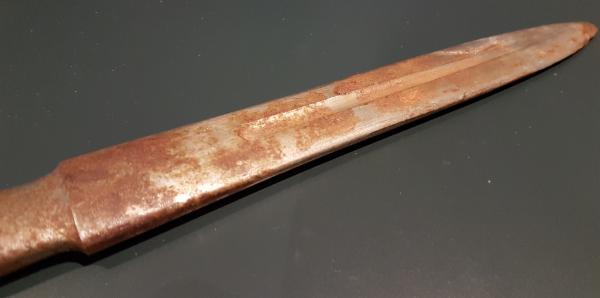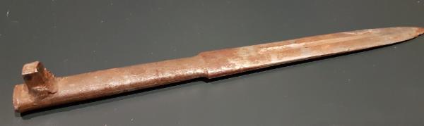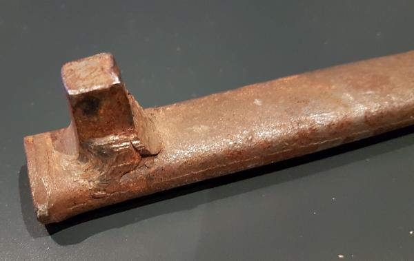 Im Einsatz bekam die Scheide schonmal Beulen und Dellen. Heutzutage würde die Scheide einfach gegen eine neue ausgetauscht. Damals dachte man pragmatischer und brachte die Scheide mit dem folgenden (natürlich nicht so verrostetem) Werkzeug einfach wieder in Form.