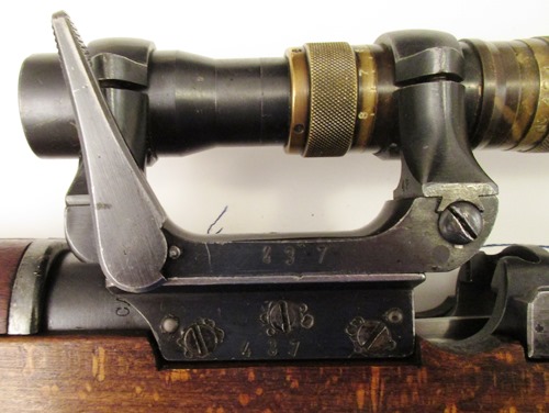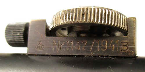 Die schwedische Krone, gefolgt von der Seriennummer/Baujahr. Hier: Nr. 1147/1941. Das "B" bedeutet, dass das Ajack in den 50er Jahren überarbeitet und verbessert wurde, und auf den Scharfschützengewehr m/41B zum Einsatz kam. Auf dem Scharfschützengewehr m/41 eingesetzte Ajack 4x90 weisen das "B" nicht auf.