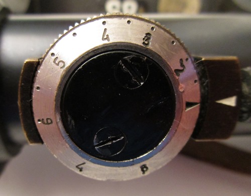 Der Ring der Entfernungseinstellung ist silberfarben und weist die Ziffern 1 - 8 auf (100 bis 800 Meter)