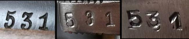 Im folgenden Bild sehen Sie die letzten drei Ziffern der Seriennummer, wie Sie auf den verschiedenen Teilen einer als "nummerngleich" angebotenen Waffe eigentlich aussehen sollte. Alle Zahlen sind erkennbar mit dem gleichen Schlagwerkzeug eingeschlagen worden.